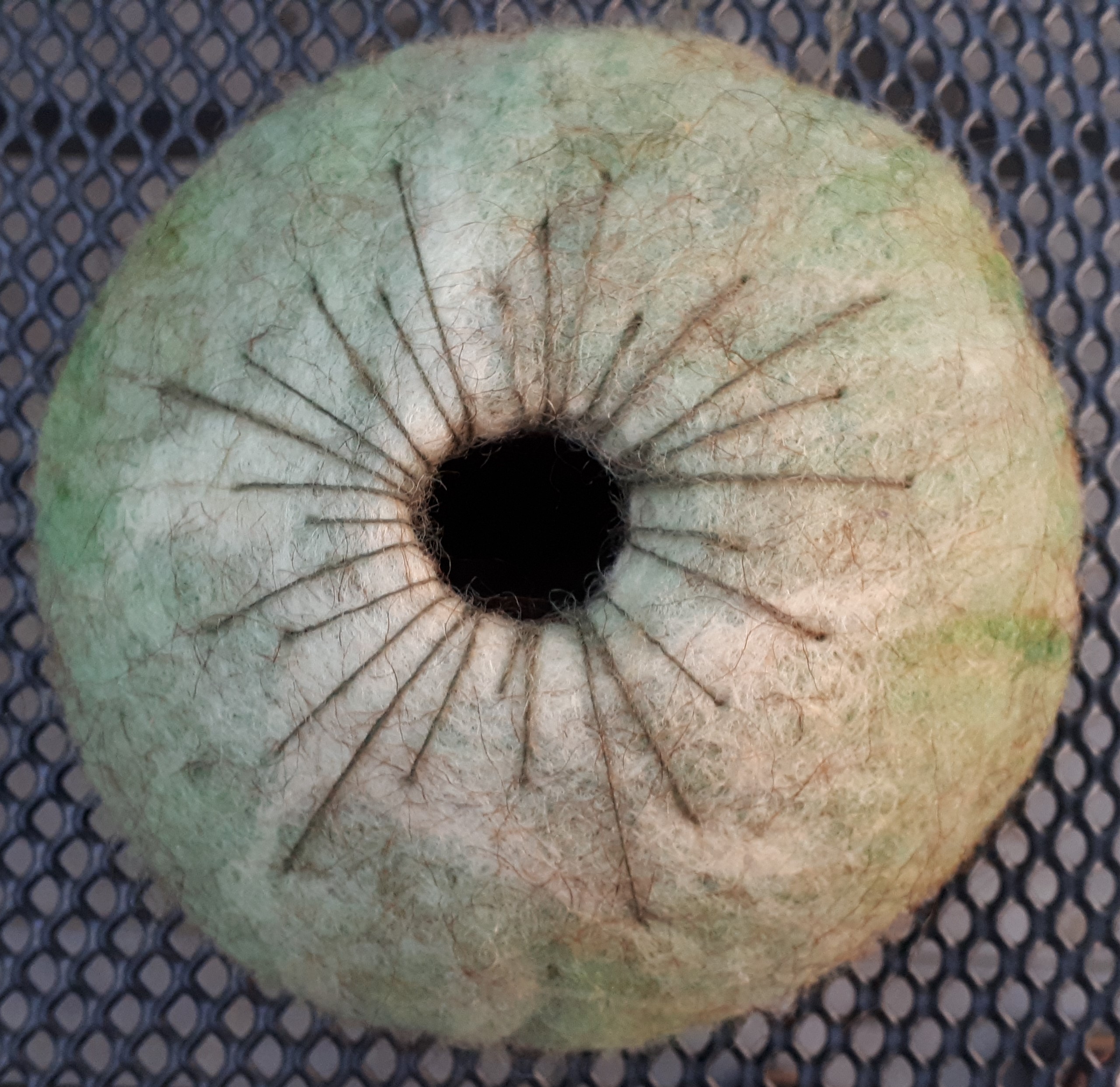 Met wat gesponnen wol (dit maal geverfd met rietpluimen, dit is zo'n mooie kleur) heb ik met zo'n ronde naald streepjes geborduurd. Ik heb dat wel eens gedaan bij een potje waar het gat niet goed vervilt was, en dat vond ik erg mooi.